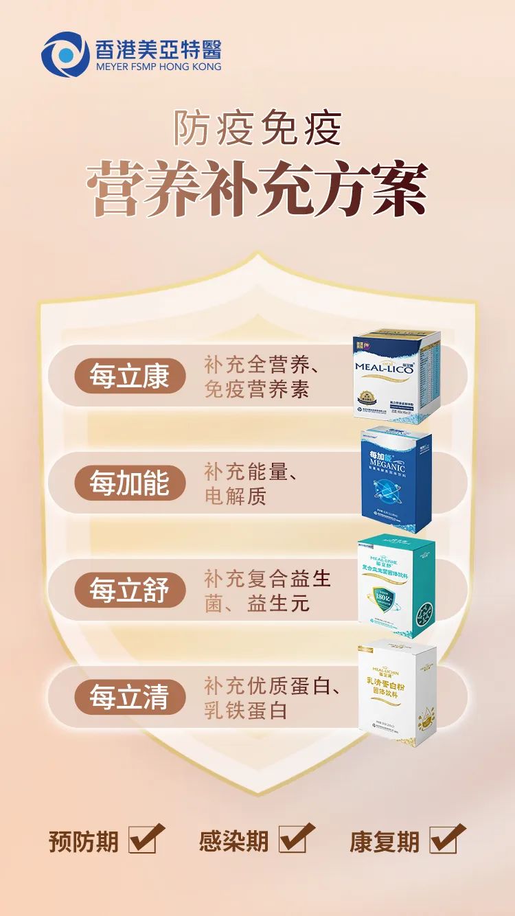 美亞醫(yī)學(xué)營養(yǎng)團隊推薦補充蛋白質(zhì)、omega-3、維生素、礦物質(zhì)、核苷酸等免疫營養(yǎng),為個人抵御感染、維護健康筑起一道堅固的免疫之墻。